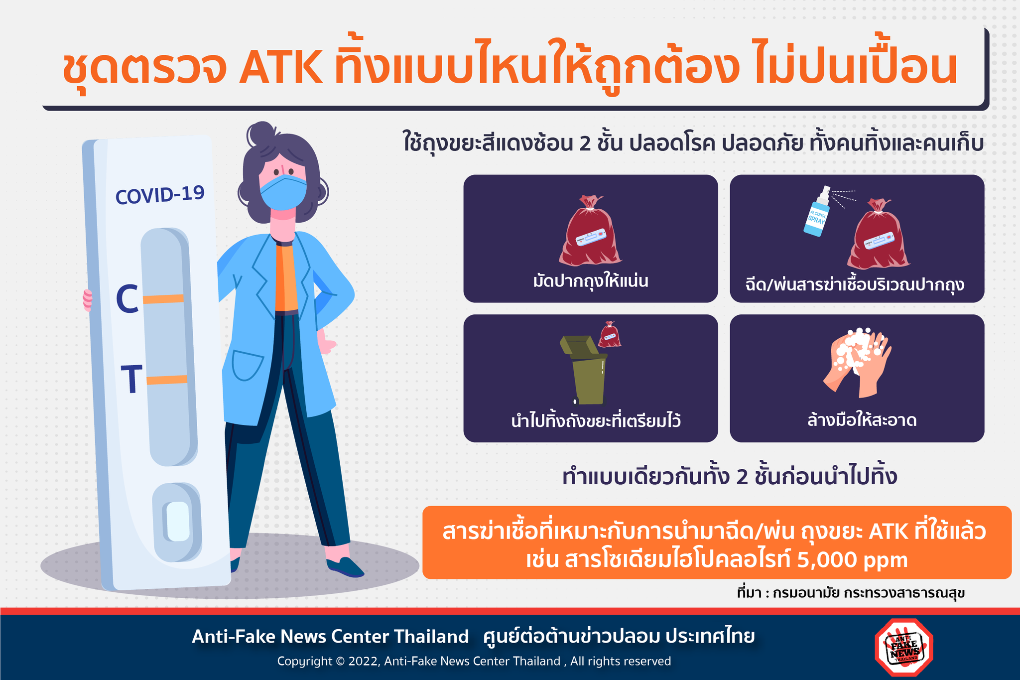 กรมอนามัย ได้ให้ข้อมูลการทิ้ง ATK ที่ใช้แล้วควรใส่ถุงขยะสีแดง 2 ชั้น เพื่อป้องกันการติดเชื้อ โดยชั้นแรกมัดปากถุงให้แน่น และฉีด/พ่นสารฆ่าเชื้อบริเวณปากถุงด้วย เช่น สารโซเดียมไฮโปคลอไรท์ 5,000 ppm สำหรับถุงขยะชั้น 2 ก็ให้ทำตามขั้นตอนแรกเช่นกัน ก่อนจะนำถุงขยะไปยังจุดพักขยะที่จัดไว้ และล้างมือให้สะอาด