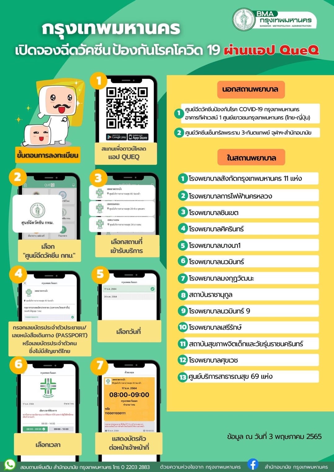 กทม. เปิดจองฉีดวัคซีนป้องกันโควิด ผ่าน แอปฯ QueQ สอบถามเพิ่มเติม สำนักอนามัย กรุงเทพมหานคร โทร. 0 2203 2883 ที่มา : กรุงเทพมหานคร โดยสำนักงานประชาสัมพันธ์