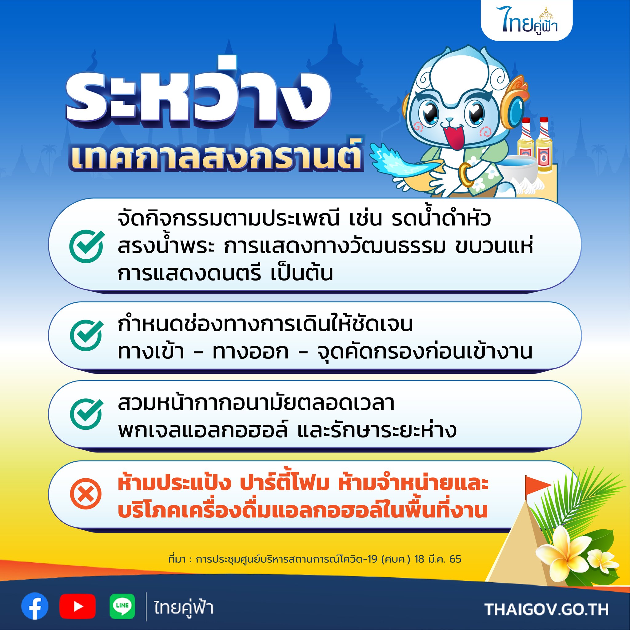 มาตรการป้องกันโควิด 19 ช่วงสงกรานต์ *การเตรียมตัวก่อนร่วมงาน *ระหว่างงานสงกรานต์ *กิจกรรมในครอบครัว *หลังกลับจากงานสงกรานต์ [ข้อมูลจากเพจกรมควบคุมโรค กระทรวงสาธารณสุข]