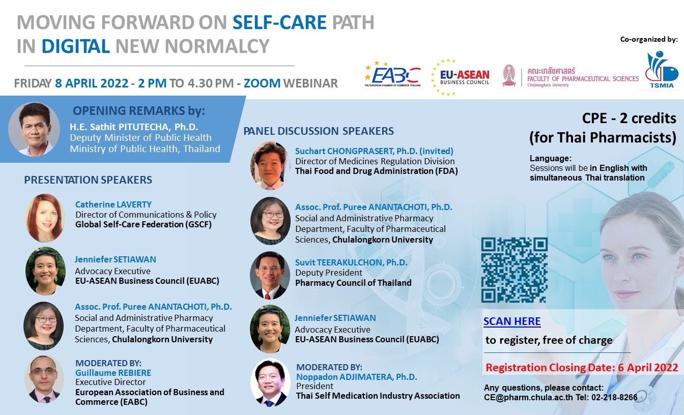 MOVING FORWARD ON SELF-CARE PATH IN DIGITAL NEW NORMALCY การประชุมวิชาการออนไลน์ (Webinar): MOVING FORWARD ON SELF-CARE PATH IN DIGITAL NEW NORMALCY ในวันศุกร์ที่ 8 เมษายน 2565 เวลา 14.00-16.30 น.