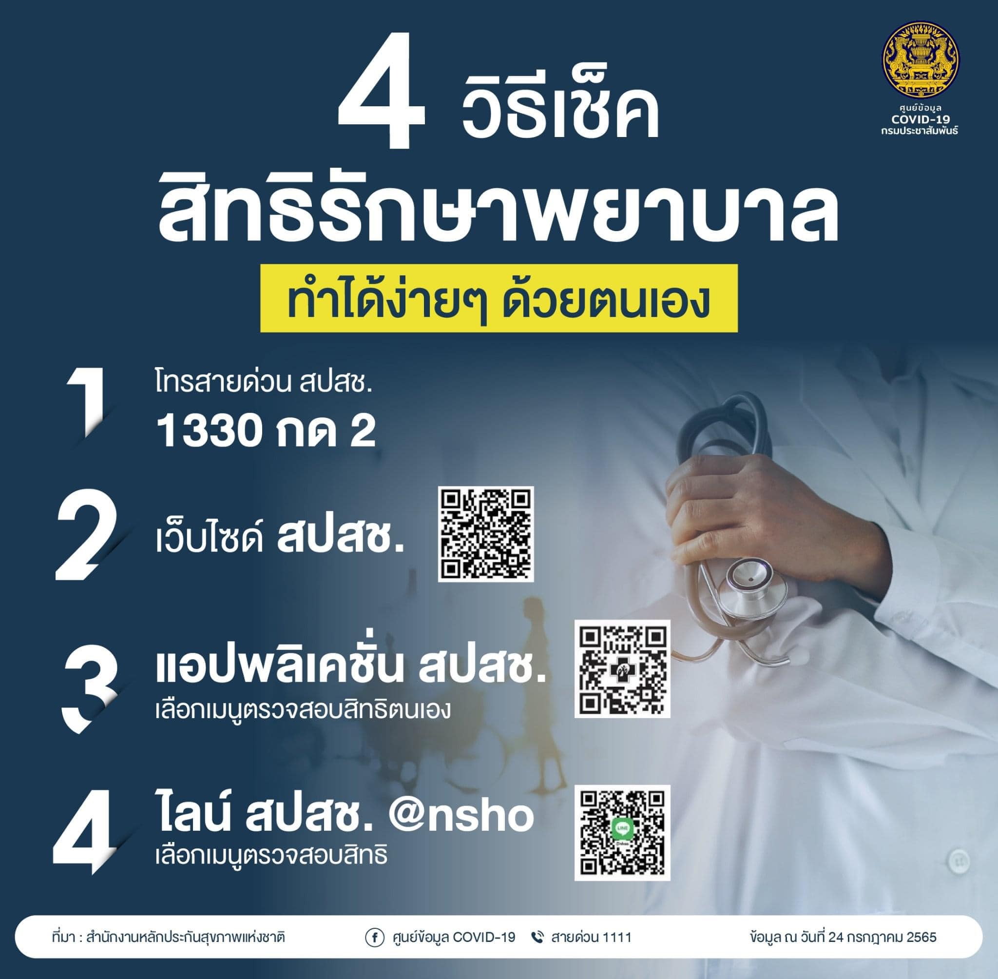 4 วิธีเช็ค สิทธิรักษาพยาบาล ทำได้ง่ายๆ ด้วยตนเอง 1. โทรสายด่วน สปสช. 1330 กด 2 2. เว็บไซด์ สปสช. 3. แอปพลิเคชั่น สปสช.เลือกเมนูตรวจสอบสิทธิตนเอง 4. ไลน์ สปสช. @nshoเลือกเมนูตรวจสอบสิทธิ ที่มา : สำนักงานหลักประกันสุขภาพแห่งชาติ